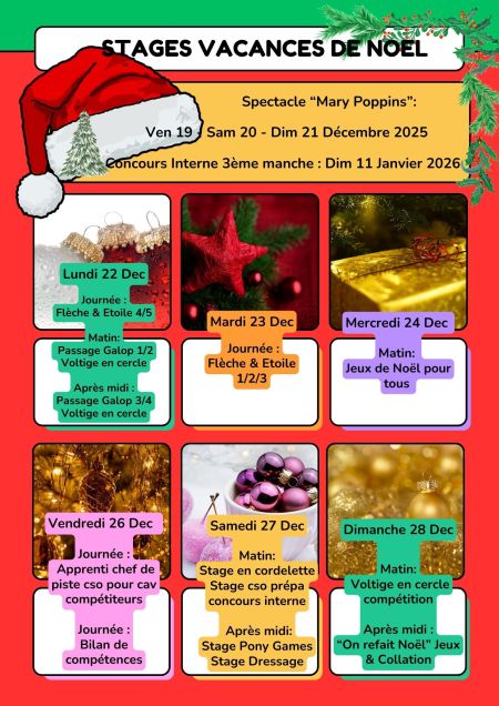 Les cours ne seront pas dispensés lors des vacances scolaires: des stages à la journée ou 1/2 journée, des cours particuliers ainsi que des soirées équestres à thème vous seront proposés.